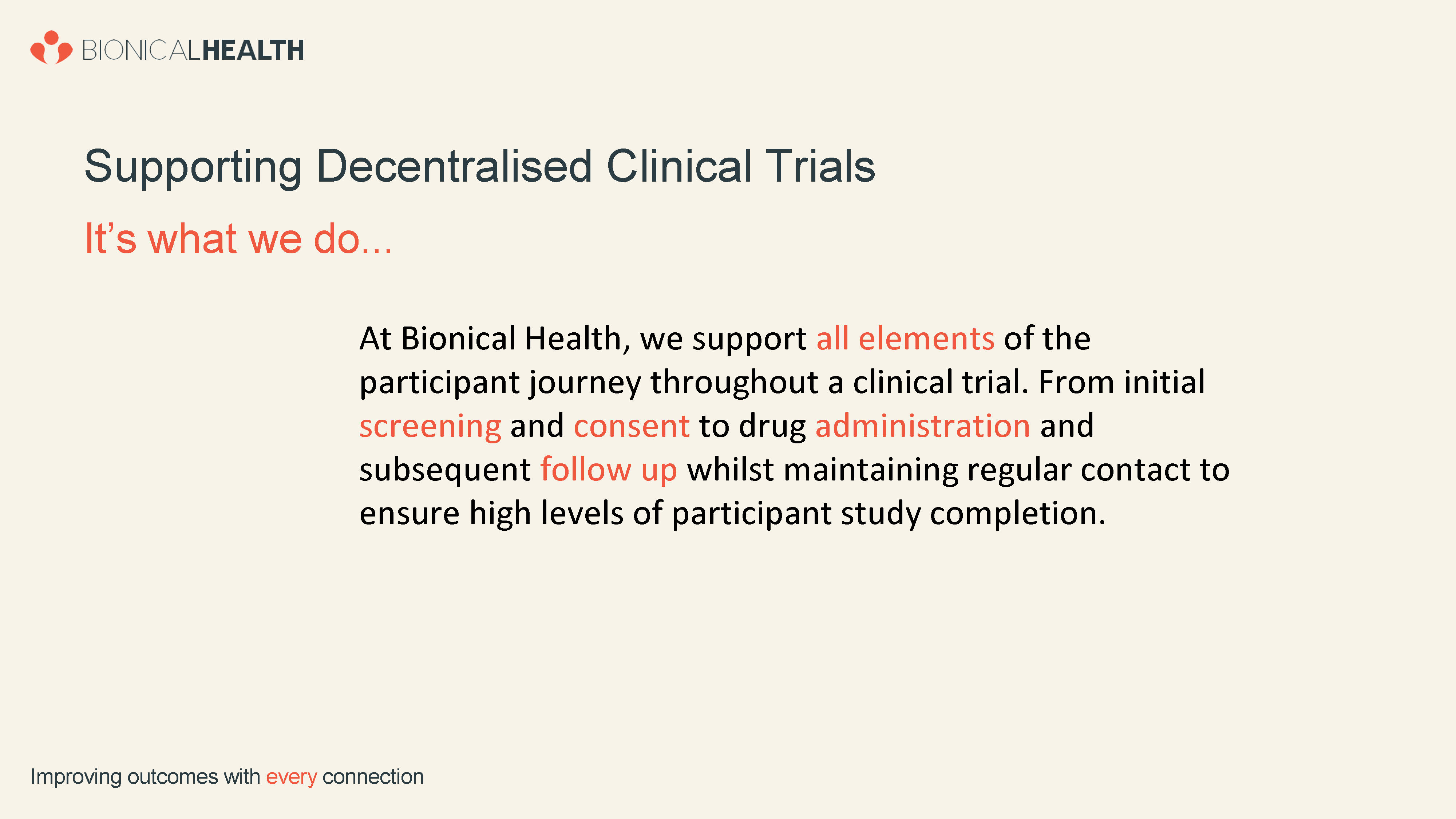 At Bionical Health, we specialise in delivering tailored solutions that ensure the success of your approach to the UK market. Our team understands the complexities of real-world evidence generation and the critical role skilled professionals play in every phase, from solution design to patient access, patient retention and data analysis. We provide experienced, fully compliant staff, ensuring that every programme is executed efficiently and to the highest standards.