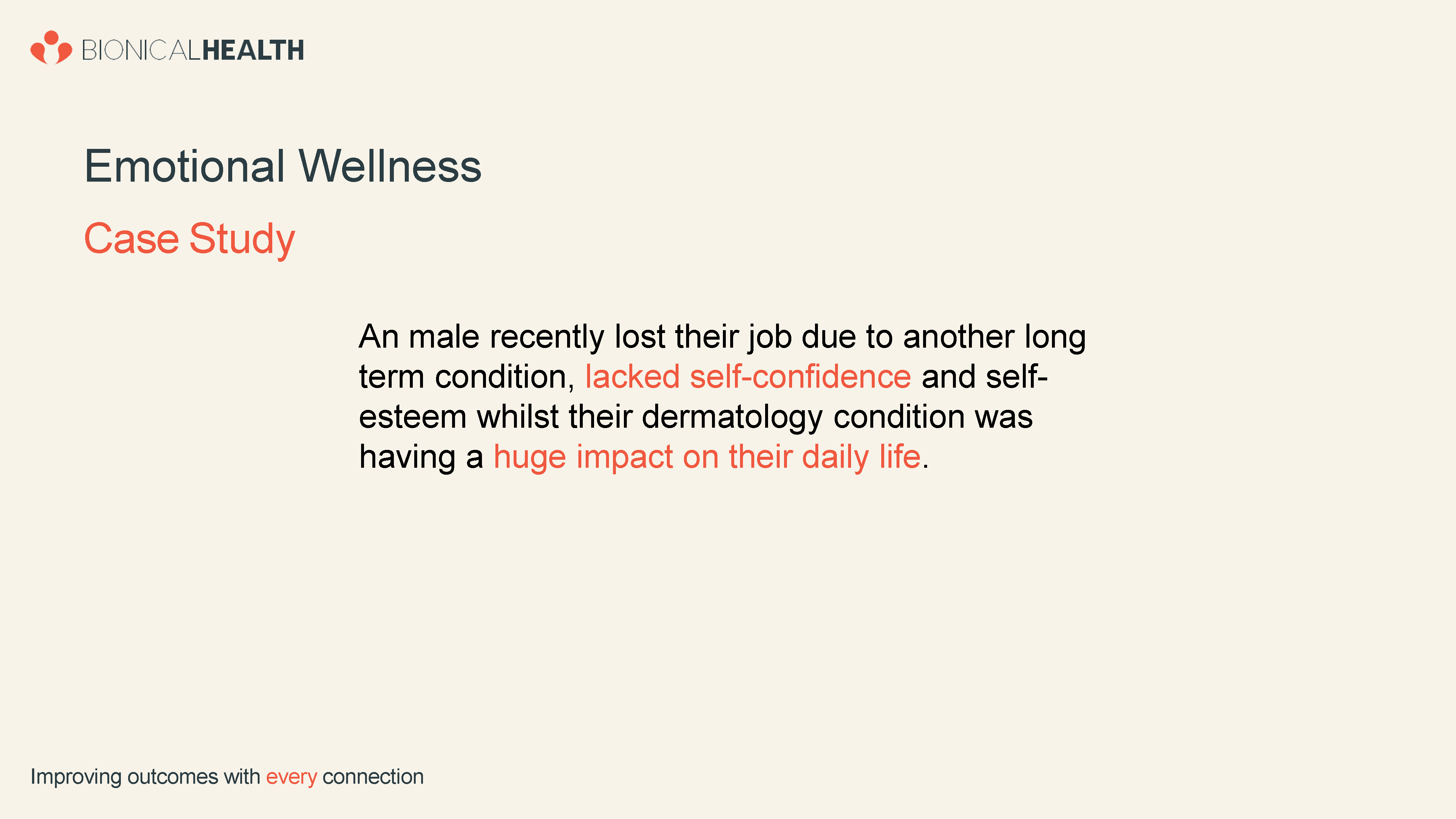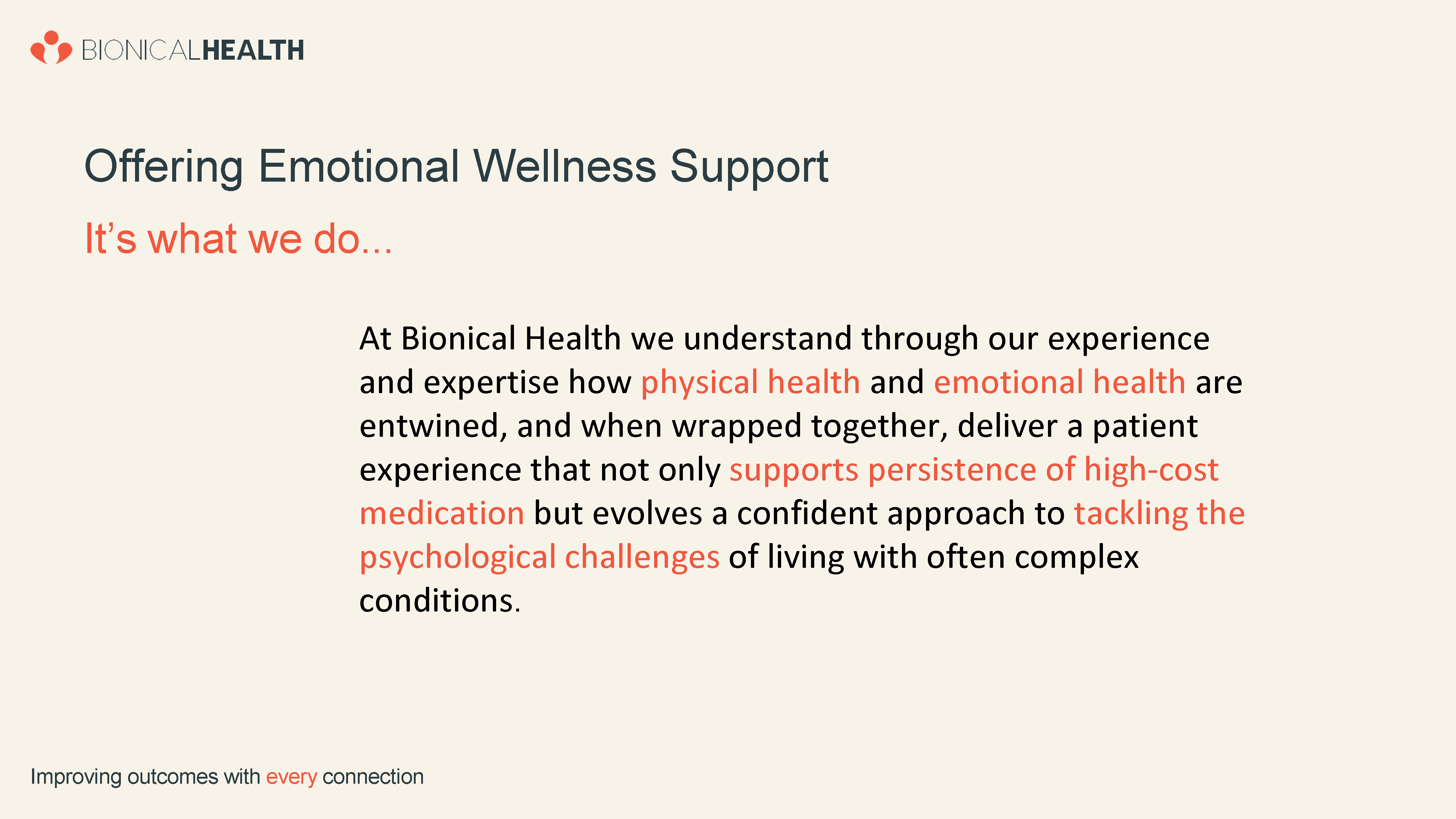 At Bionical Health we understand through our experience and expertise how physical health and emotional health are entwined, and when wrapped together, deliver a patient experience that not only supports persistence of high-cost medication but evolves a confident approach to tackling the psychological challenges of living with often complex conditions.