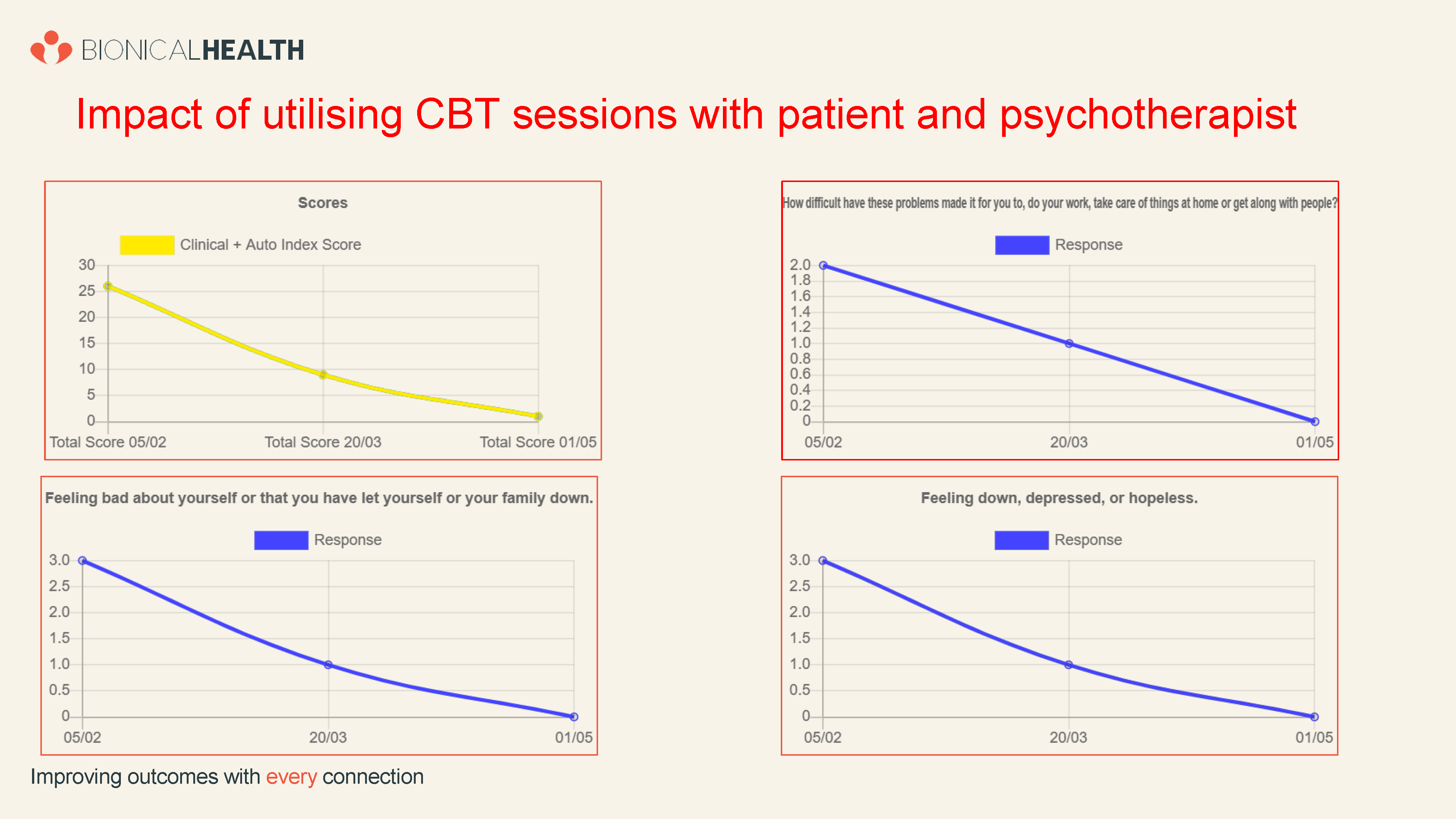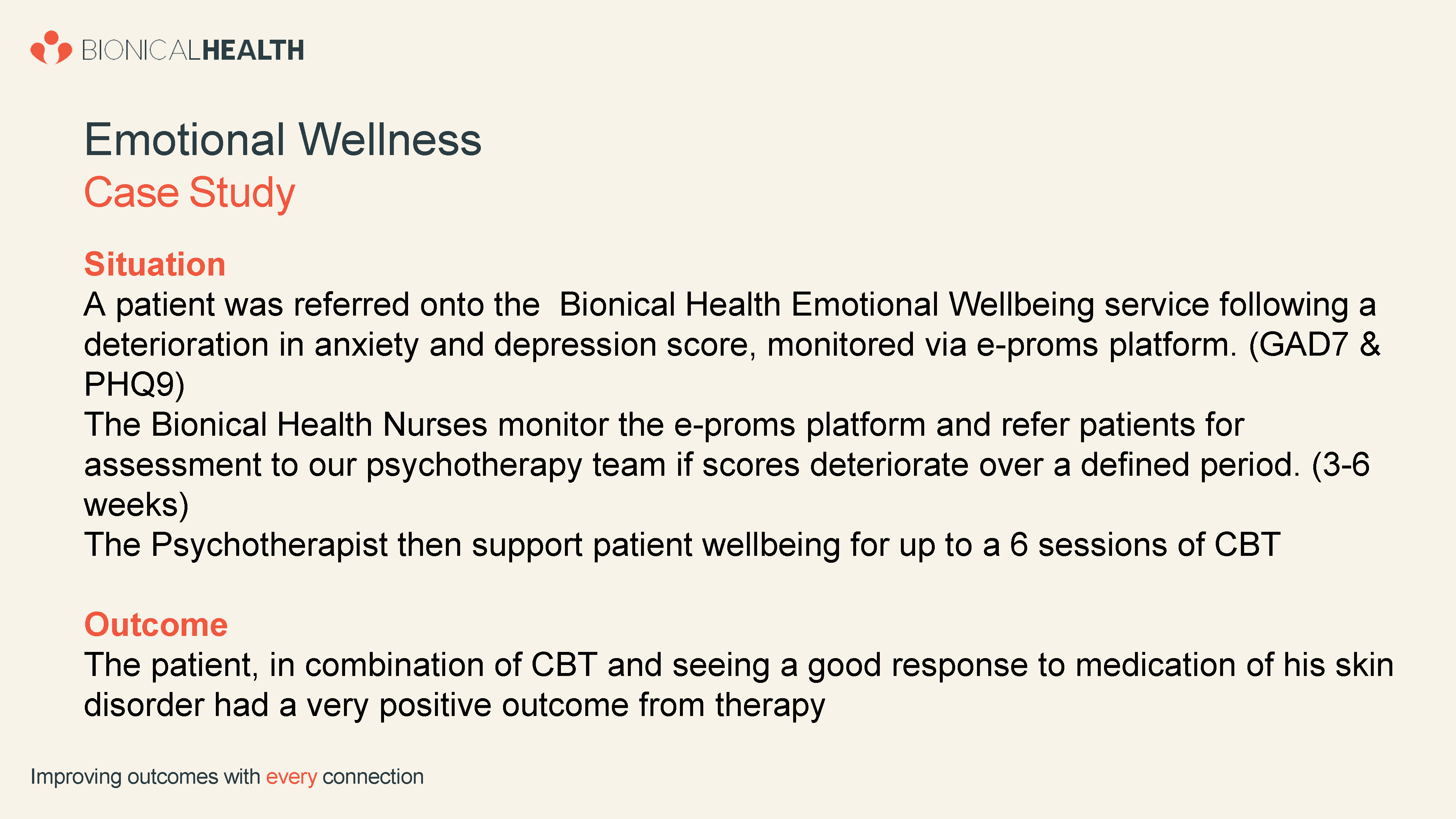 At Bionical Health we provide an emotional wellbeing service that focuses on anxiety and depression monitoring, frequently associated with long term complex physical illness. We provide monitoring, assessment and triage via our highly skilled and experienced Cognitive Behavioural Therapists (registered with BACP or BABCP) providing talking therapy, or accessing 24/7 AI chatbot programmes created by psychologists to support common mental health problems.